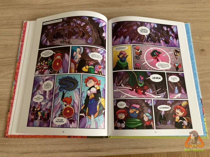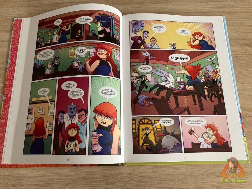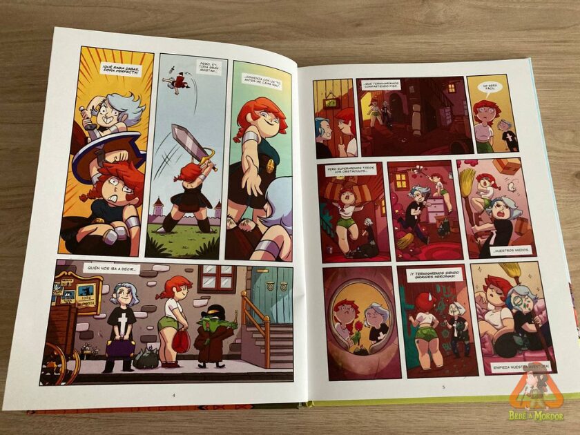 Pero aquí reside la grandeza de Sara. Nos cuenta todo esto de manera humorística y original, con unos personajes femeninos fuertes y cero sexualizados (¡con unas armaduras en condiciones!) y usando los monstruos como trasfondo, recordándonos así las partidas de rol de Dungeons and Dragons donde tenías que ir a la taberna para que te encargasen tu misión.
